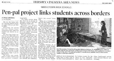 Last week, my 4th grade students skyped with another 4th grade class in Middleton, Pennsylvania. We had paired up through the guidance counselor at the school in Pennsylvania who is an alum of Mazapan School. She was looking to do an interactive activity with students from her school so they could learn more about a different part of the world. We ended up becoming pen pals with this class and my students wrote a few letters back and forth before we had our skype session. It lasted an hour long and each student got to talk with their pen pal one on one for a few minutes to ask them some questions. The cool thing however was that the local newspaper ended up writing a piece on the activity! Take a look...(click on the image to make it bigger)
